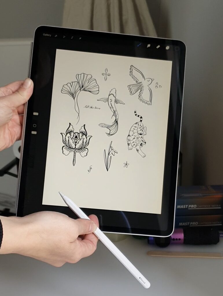 Een iPad kun je voor veel meer gebruiken dan voor het tekenen van tattoos natuurlijk, dus wellicht heb je er al eentje in huis. Om te leren tatoeëren niet essentieel, maar om een tattoo artiest te kunnen zijn wel. Ik kocht de iPad pro 12 uit 2018, via Refurbed. Daar kocht ik een pen bij voor €100, want zonder pen kun je niet tekenen. En ik kocht het tekenprogramma Procreate, voor de eenmalige prijs van €15,99.