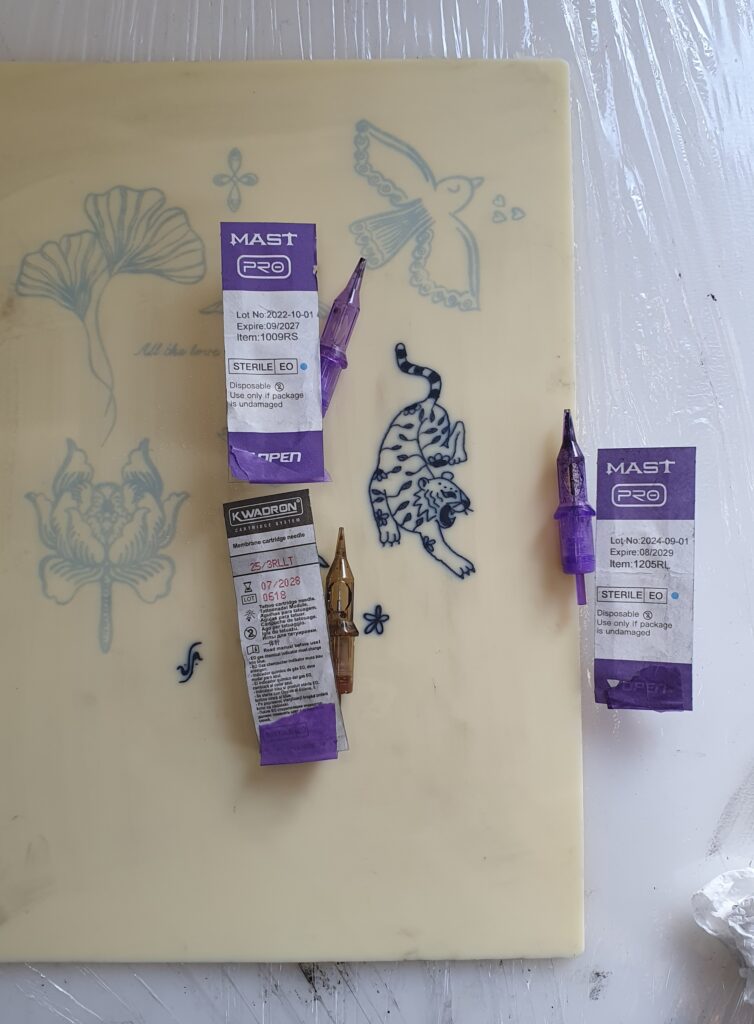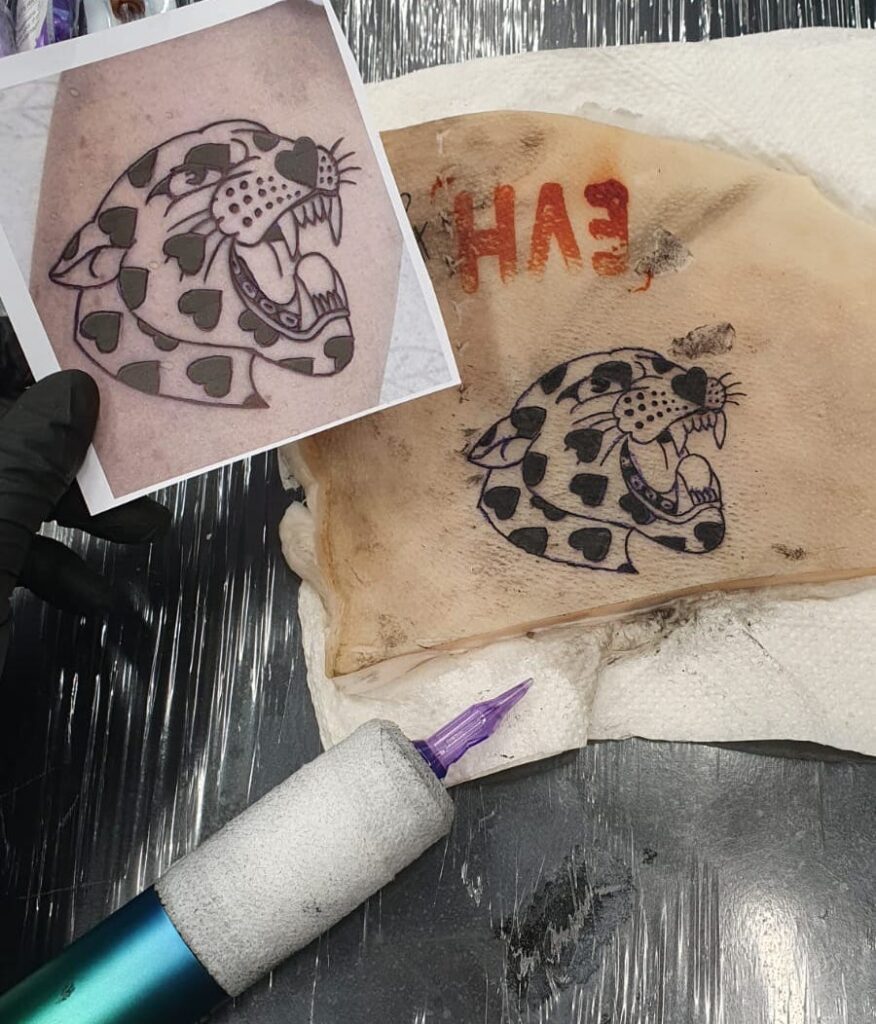 Je kunt varkenshuid meestal gratis bij de slager ophalen, omdat het overschot is en het anders wordt weggegooid. Ik werk hier niet mee omdat ik het niet hygiënisch vindt en je het niet kunt bewaren voor in je portfolio. Tijdens de cursus tatoeëren die ik heb gevolgd, hebben we wel geoefend op varkenshuid: