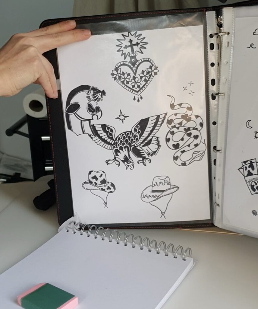 Het is belangrijk om ook je tekenvaardigheden te verbeteren als je wil leren tatoeëren. Wanneer je bijvoorbeeld het stencil wegveegt, moet je de tattoo kunnen afmaken op gevoel. Digitaal tekenen is te makkelijk omdat jouw lijnen gecorrigeerd worden. Daarom heb ik ook schetspapier en potloden aangeschaft van de Hema, om tattoos te tekenen op papier.